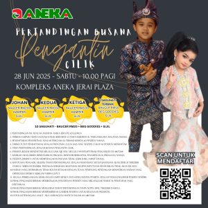 Sertai Pertandingan Busana Pengantin Cilik di Kompleks Aneka Jerai Plaza pada 28 Jun 2025! Terbuka kepada kanak-kanak 12 tahun ke bawah. Menangi baucar, hamper, goodies & sijil. Daftar sekarang dan raikan gaya tradisional si cilik anda!